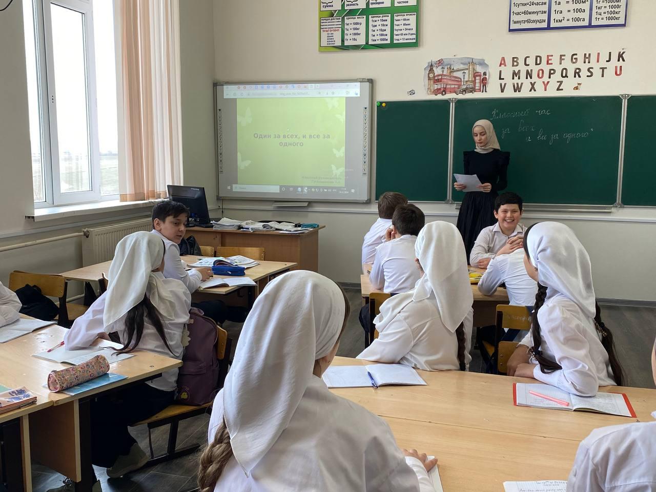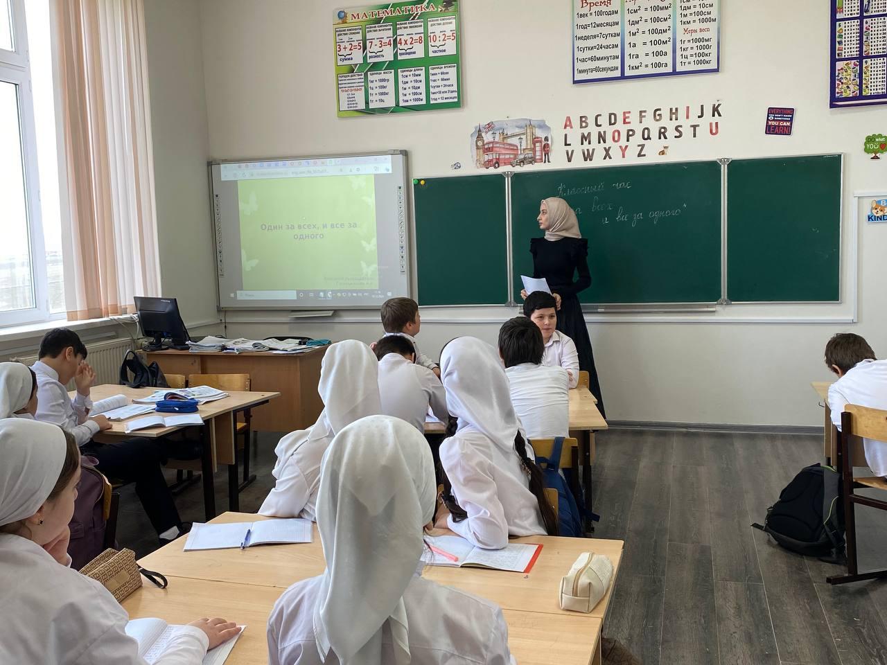 Ахмадова Мадина начала классный час с объяснения основной идеи фразы «Один за всех и все за одного», рассказав о значении единства и поддержки в команде.
